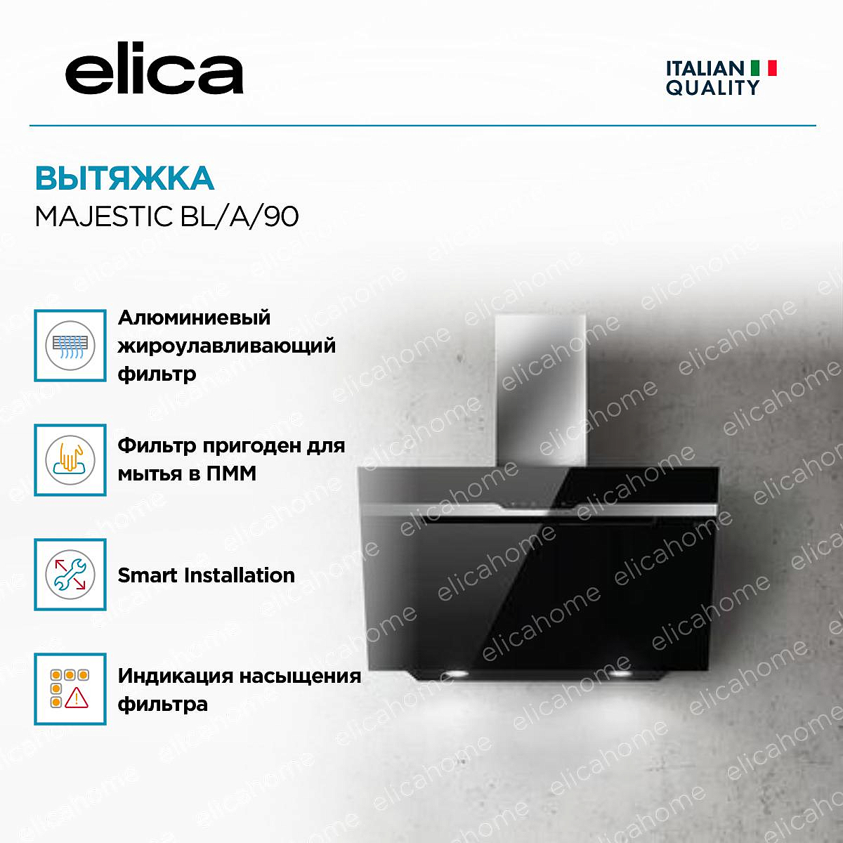 Вытяжка Elica MAJESTIC BL/A/90 имеет нестандартные габариты. У данного варианта ширина составляет целых 90 см. Такие модели обычно применяются в квартирах-студиях или в просторны кухнях, где установлена плита на 4 конфорки и больше. Модельный ряд Design Fabrizio Crisà указывает на сочетание сдержанной роскоши и высокой функциональности. Фасад изготовлен из чёрного стекла со ставками нержавеющей стали. Расположенные снизу светодиодные лампы дают дополнительное освещение рабочей поверхности.