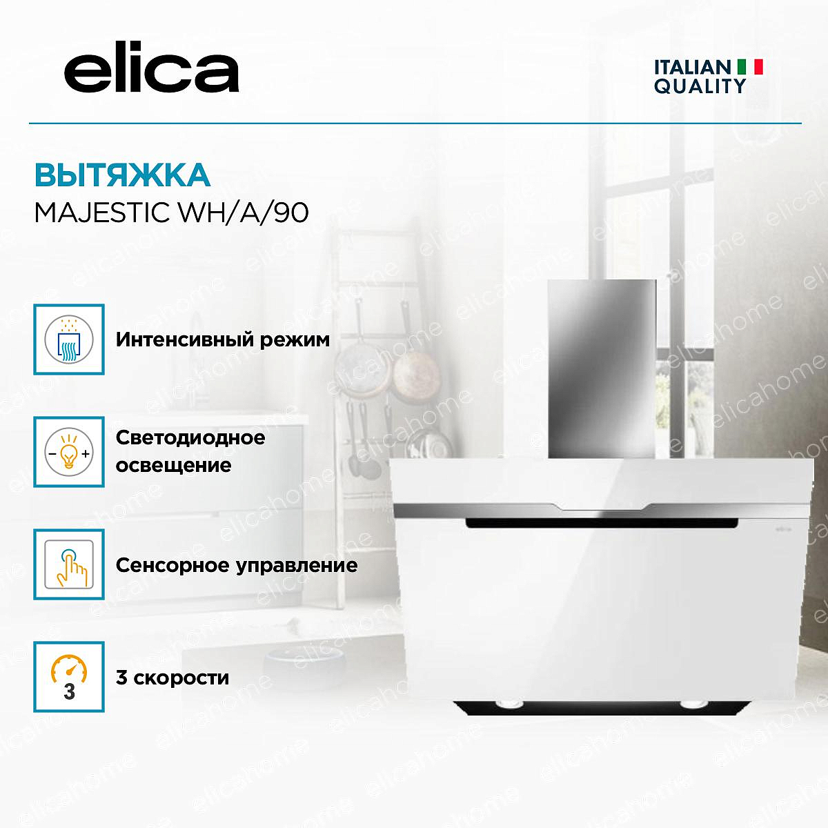 - Вытяжка Элика MAJESTIC WH/A/90 имеет эргономичные формы при ширине 89,8 см.