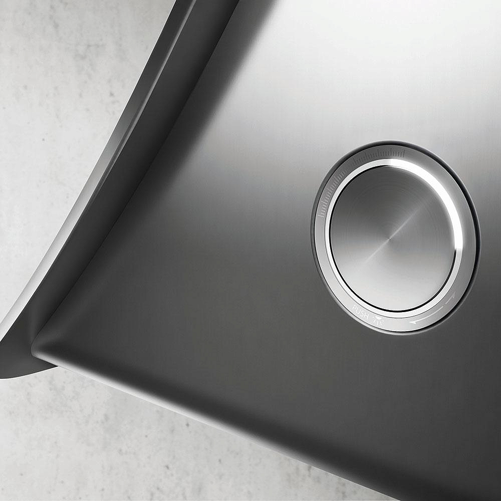 Для изменения настроек работы вытяжки необходимо вращать ручку электронного управления до соответствующих значений. Программатор утапливаемый, в нерабочем состоянии на поверхности консоли управления нет никаких выступающих элементов.