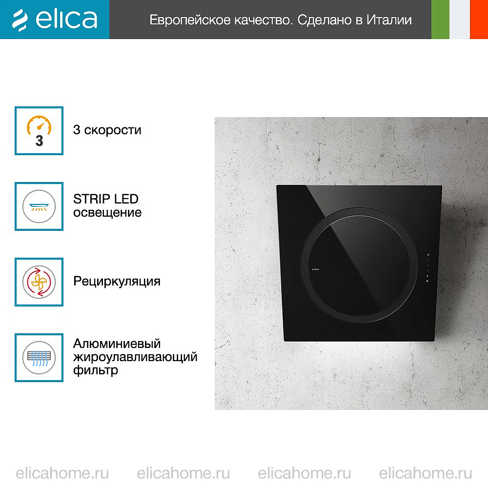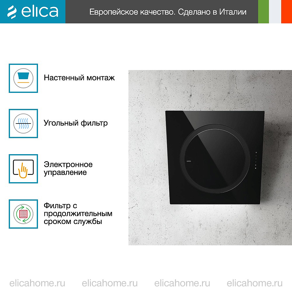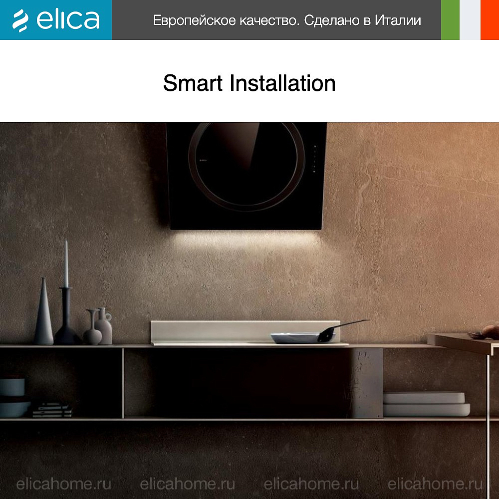 Устройство крепится к стене. В ассортименте Elica на стену монтируются настенные и наклонные вытяжки.