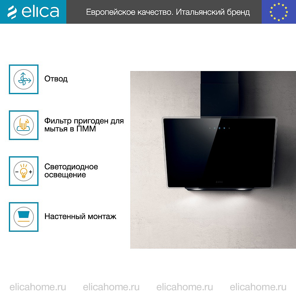 Устройство крепится к стене. В ассортименте Elica на стену монтируются настенные и наклонные вытяжки.