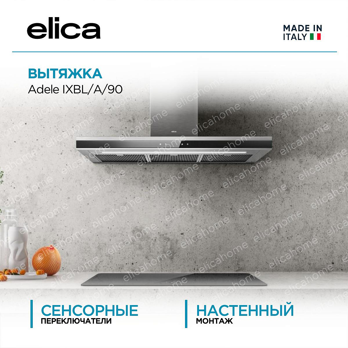 Устройство крепится к стене. В ассортименте Elica на стену монтируются настенные и наклонные вытяжки.