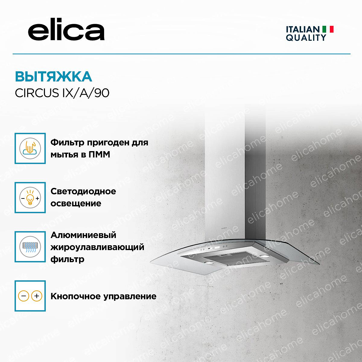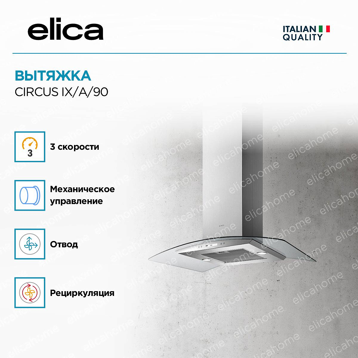 Дизайн: Вытяжка ELICA CIRCUS IX/A/90 представлена в цвете «Нержавеющая сталь». Данный классический вариант подойдет к любому кухонному интерьеру. Материалы, из которых она выполнена — стекло и нержавеющая сталь, обеспечивают долгий срок эксплуатации. Внешне модель выглядит очень гармонично, и понравится каждому.