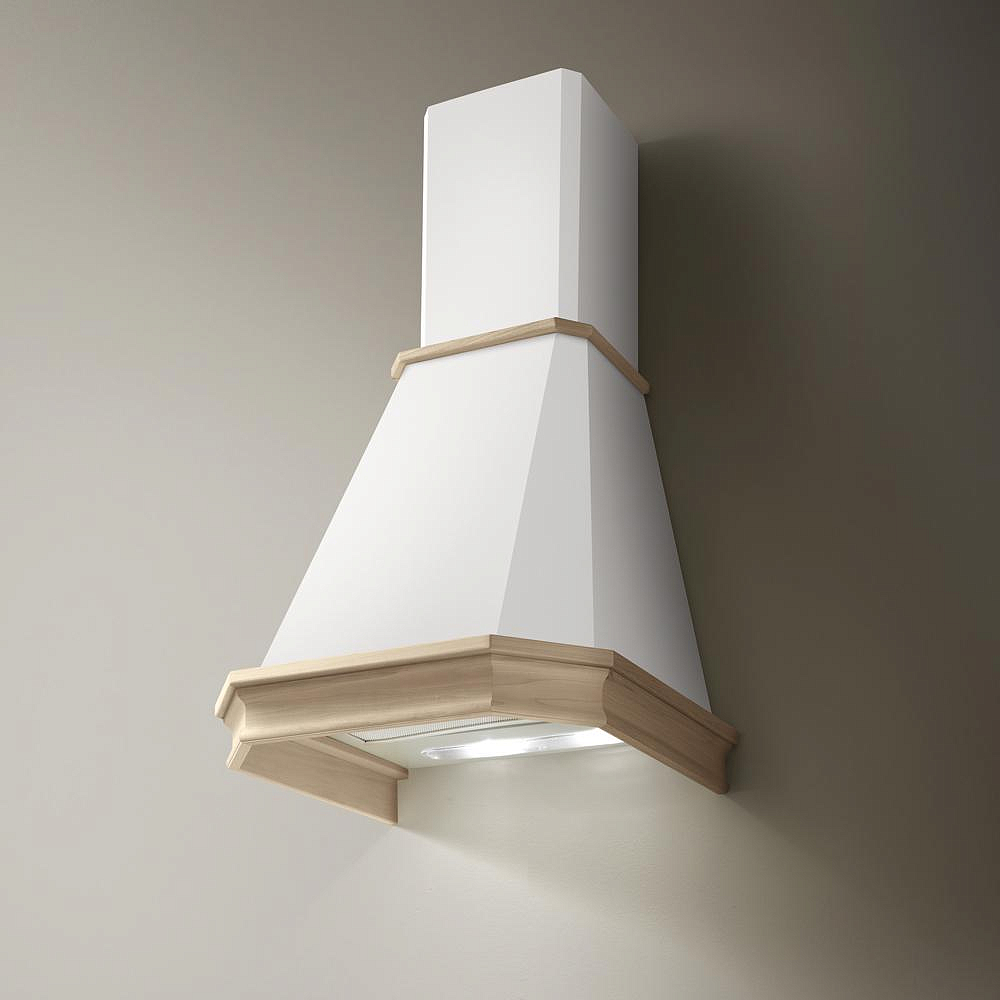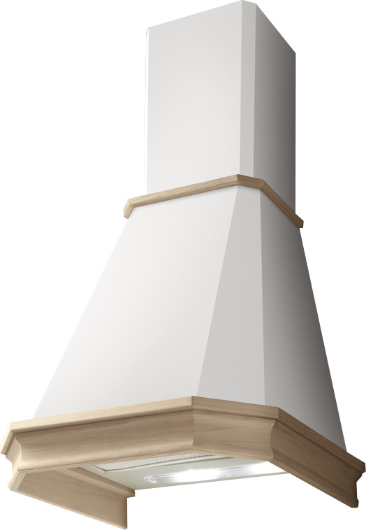 Кухонная техника выполнена в светлом дизайне — она представлена в корпусе белого цвета и дополнена рамкой из неокрашенного натурального дерева. Своеобразный дизайн позволяет вам установить вытяжку в кухонный интерьер любого стиля. Кроме этого, она удобна своими небольшими габаритами: высота — 59,5-96 см, ширина — 59,8 см, глубина — 50,1 см.