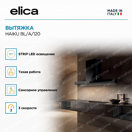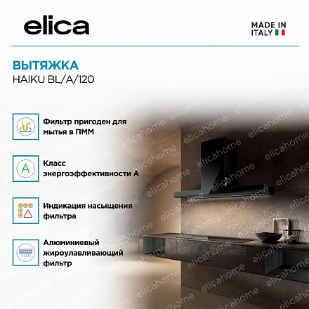 Вытяжка ELICA HAIKU BL/A/120 элегантно выглядит, легко устанавливается, хорошо вписывается в интерьер современной кухни. Это современная высокопроизводительная модель, работающая с низким уровнем шума и эффективно удаляющая загрязнённый воздух из помещения.