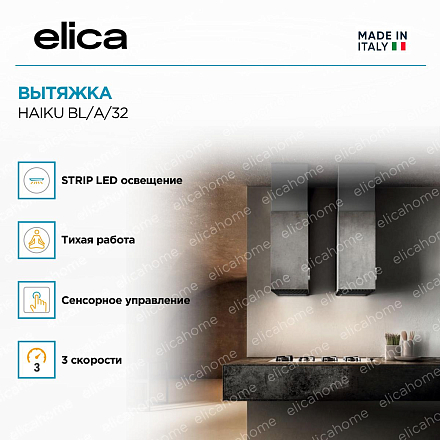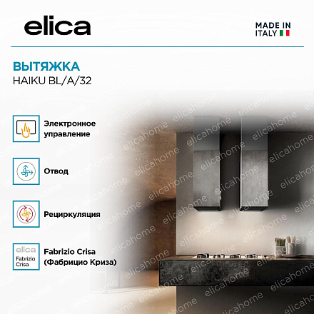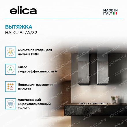 Вытяжка ELICA HAIKU BL/A/32 — это настенная модель в цвете черное стекло. Она выглядит элегантно и стильно. Ее можно установить как в классических, так и в современных интерьерах. Это высокопроизводительная техника, предназначенная для удаления чада и неприятных запахов, возникающих во время приготовления пищи.