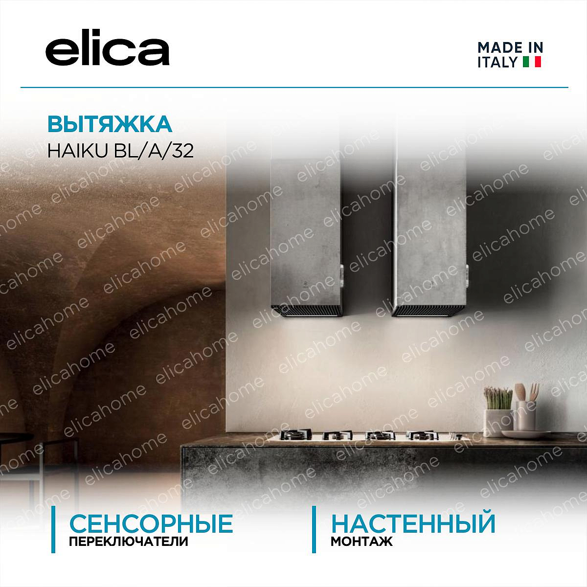 Устройство крепится к стене. В ассортименте Elica на стену монтируются настенные и наклонные вытяжки.