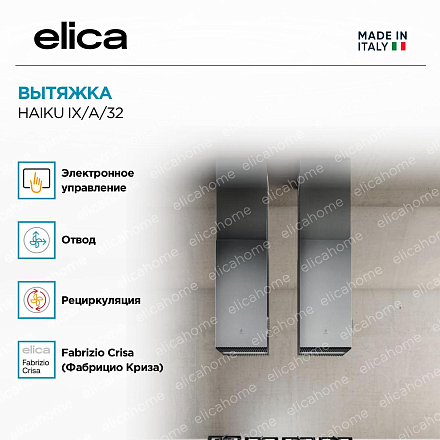 Вытяжка ELICA HAIKU IX/A/32 MB выполнена в цвете «Нержавеющая сталь». Такой дизайн является универсальным, поэтому модель подойдет к любому интерьеру вашей кухни или иного помещения.