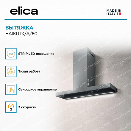 Вытяжка Elica HAIKU IX/A/60 выполнена в современном стиле. Серый металлический корпус придает модели элегантный вид. Вы легко впишете устройство в любой интерьер (от классики до модерна и лофта). Прочный металл не подвержен коррозии, не царапается и не деформируется. С его поверхности легко удалить пыль и грязь. Прибор не меняет цвет со временем. Он станет не только функциональным предметом, но и элементом декора. Электронное управление интуитивно понятное и простое в использовании. Сенсорные кнопки находятся сборку, вы легко дотянетесь до них во время готовки.