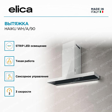 Вытяжка ELICA HAIKU WH/A/90 — элегантное и эффективное устройство для кухни. Она представлена в белом цвете. Данный классический дизайн подойдет к любой кухни. Материал, из которого она выполнена, устойчив к температурному воздействию и характеризуется долгим сроком эксплуатации.