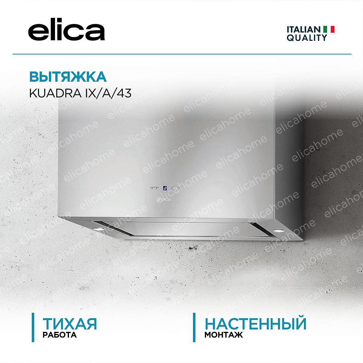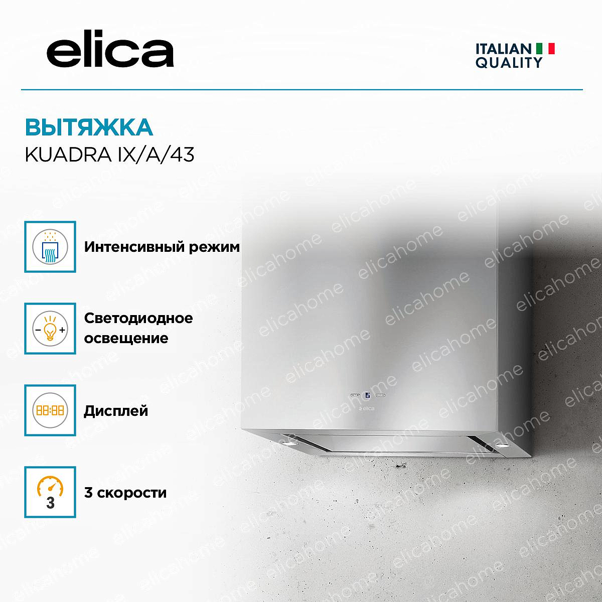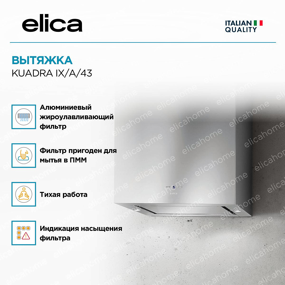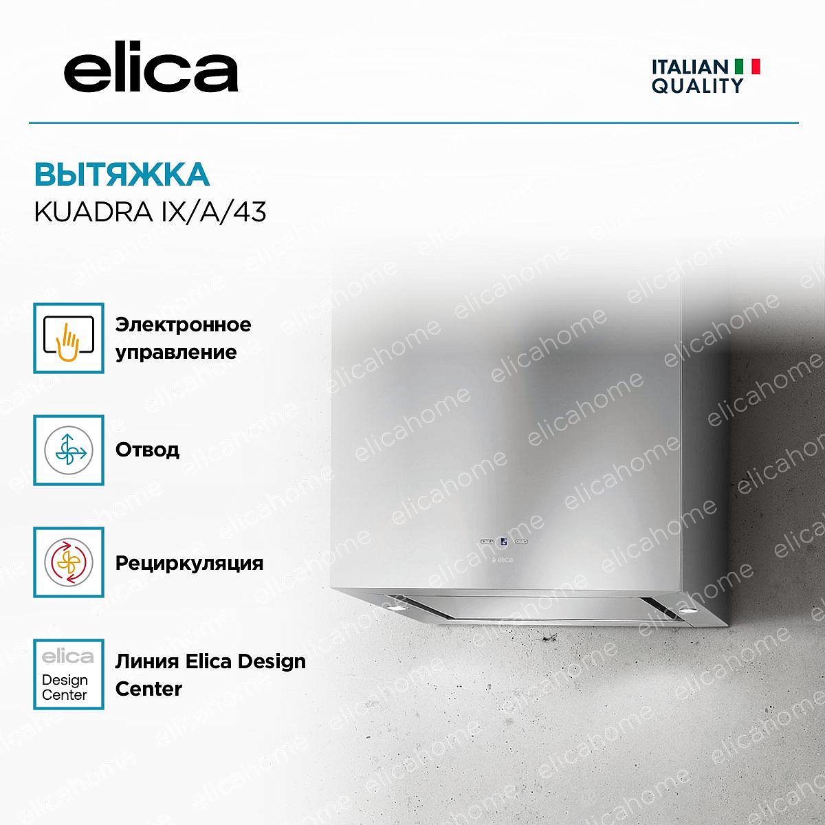 Дизайн. Настенная вытяжка ELICA KUADRA IX/A/43 имеет строгий геометричный дизайн. Корпус выполнен в цвете «нержавеющая сталь» и может быть интегрирован в любой современный кухонный интерьер. Фасад дополнен информативным дисплеем, на котором отображаются пользовательские настройки.