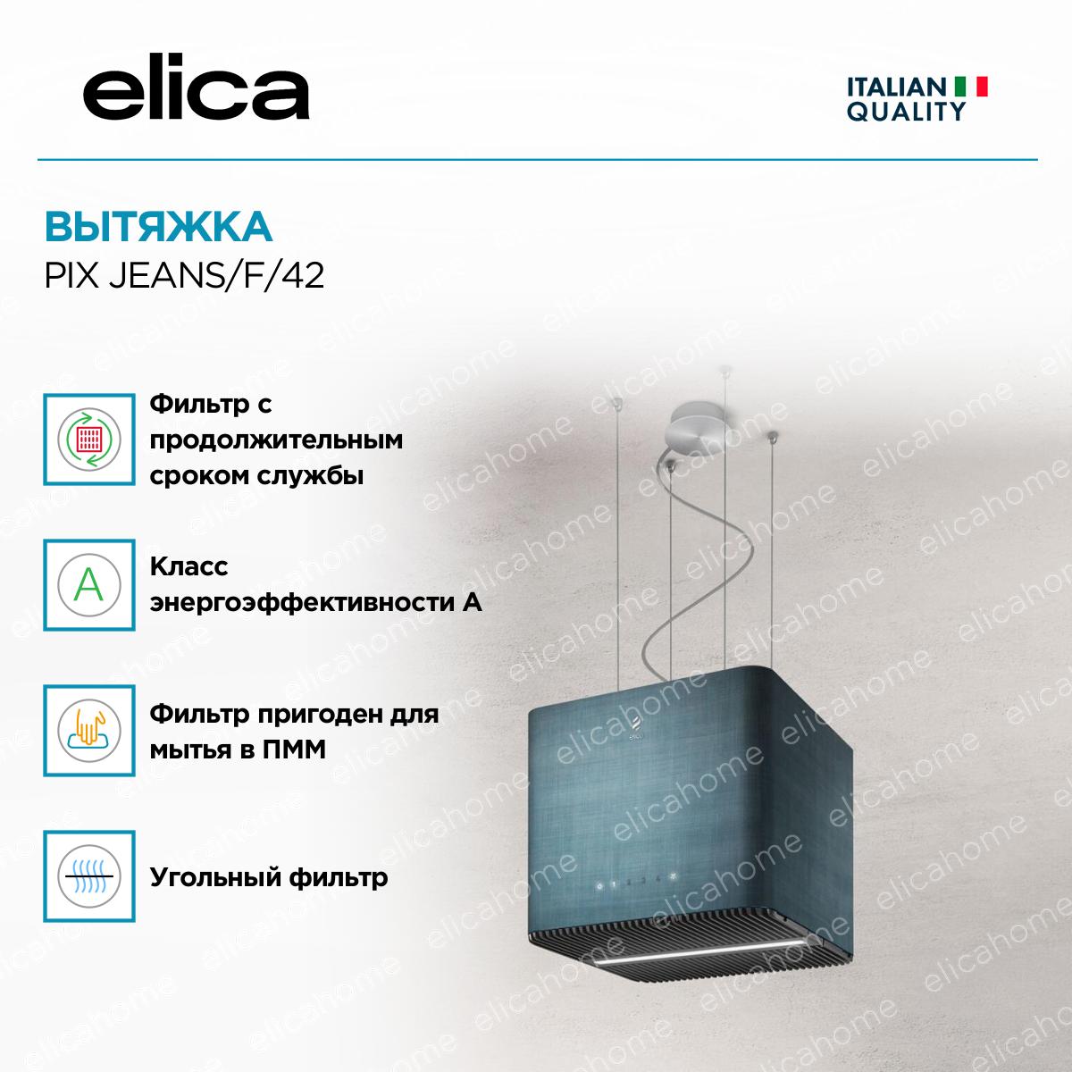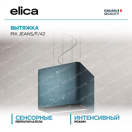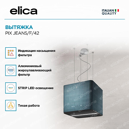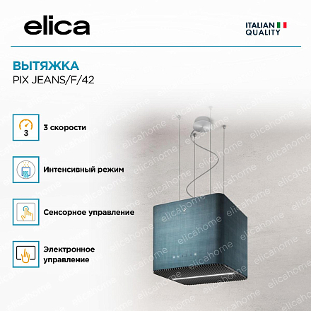 Вытяжка Elica PIX JEANS/F/42 в джинсовом корпусе из стекла и металла предназначена для установки под потолок. При такой конструкции модель на любой кухне не займет места, ее габариты: высота — 55-130 см, ширинам — 42 см, глубина — 42 см.