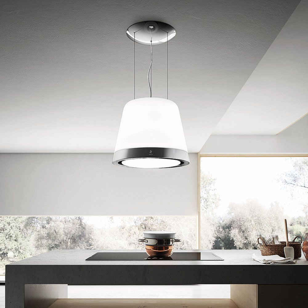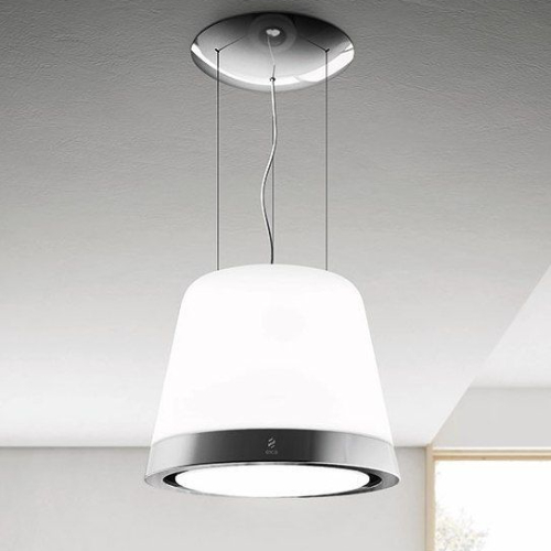 Дизайн. Подвесная вытяжка-люстра ELICA SUMMILUX IX/F/50 выполнена из белого матового стекла и дополнена обручем из нержавеющей стали. На нижней кромке расположена панель управления, все функции которой также включаются с пульта ДУ. Потолочный монтаж позволяет установить вытяжку над кухонным островком.