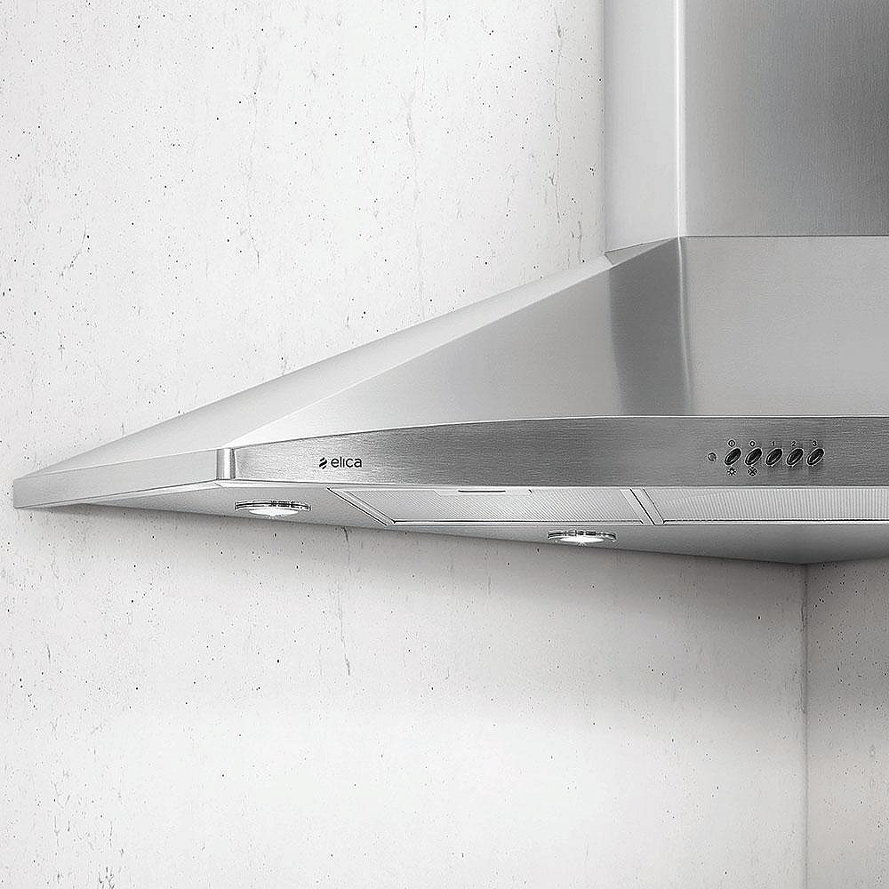 Устройство крепится к стене. В ассортименте Elica на стену монтируются настенные и наклонные вытяжки.