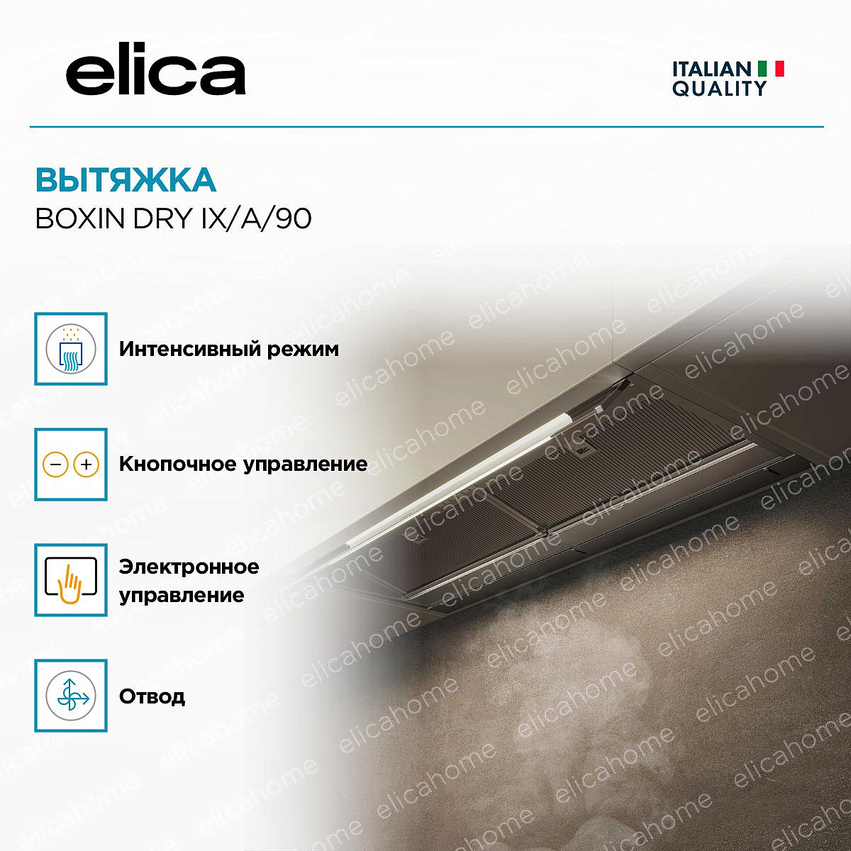 Вытяжка Elica BOXIN DRY IX/A/90 сочетает в себе качество, эффективность и стиль. Производство расположено в Италии, что является гарантией надежности и долговечности. Благодаря своим функциональным возможностям и привлекательному дизайну модель станет незаменимым помощником на вашей кухне. Изготовленная из нержавеющей стали, она впишется в любой интерьер, от классики до современного стиля или хай-тека. Электронное управление позволяет легко менять настройки изделия в соответствии с текущими задачами. Два варианта монтажа — в подвесной шкаф или на стену. Крепеж вы найдете в комплекте.