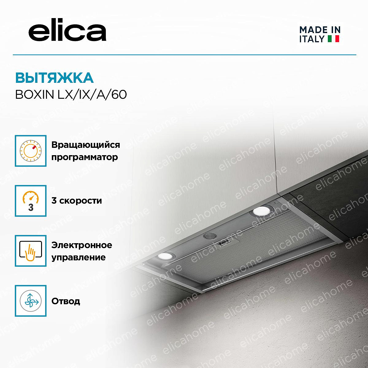 Вытяжка Elica BOXIN LX/IX/A/60 — встраиваемая модель серии BOXIN и дизайнерской коллекции ELICA DESIGN CENTER итальянского производства, выполненная в универсальном цвете «нержавеющая сталь».
