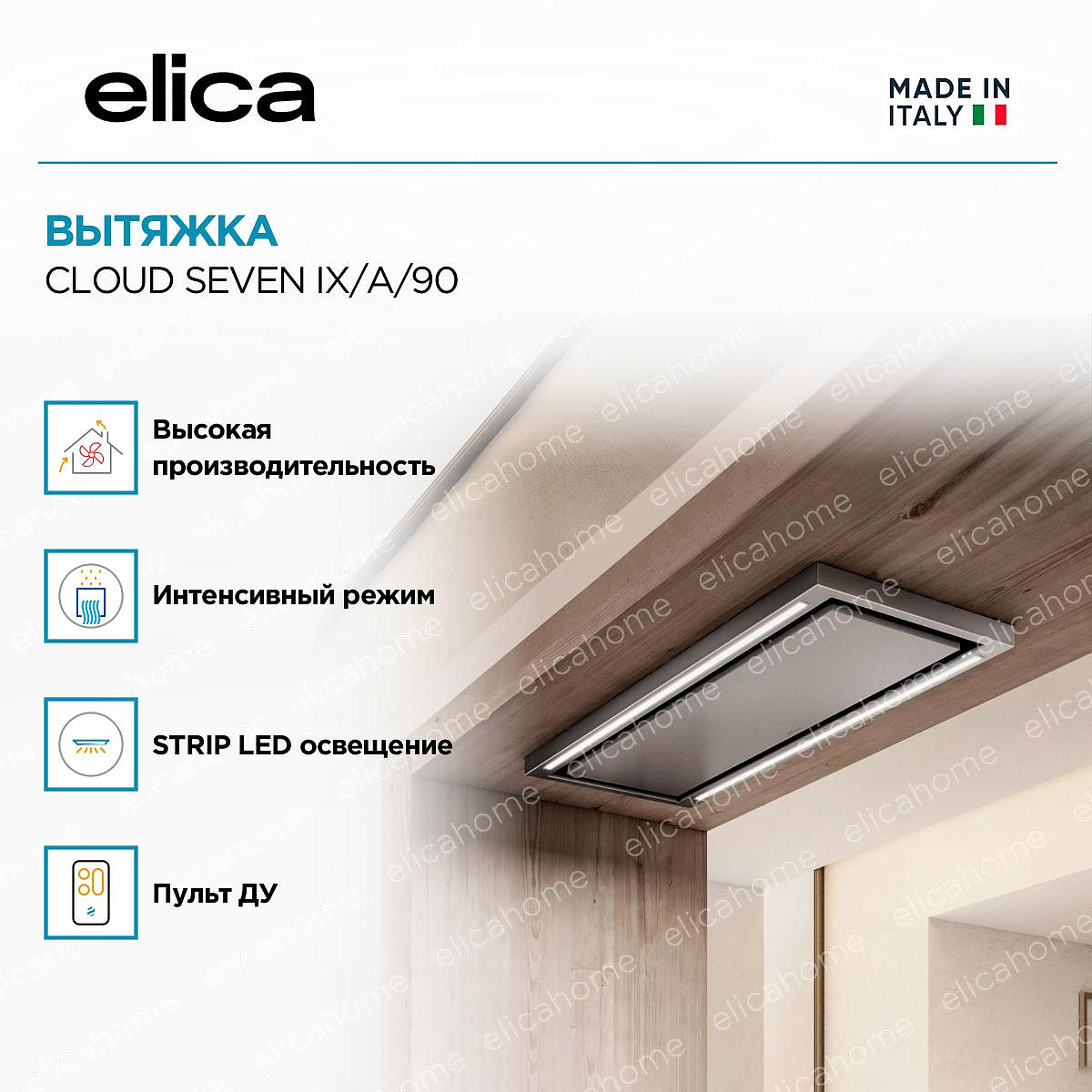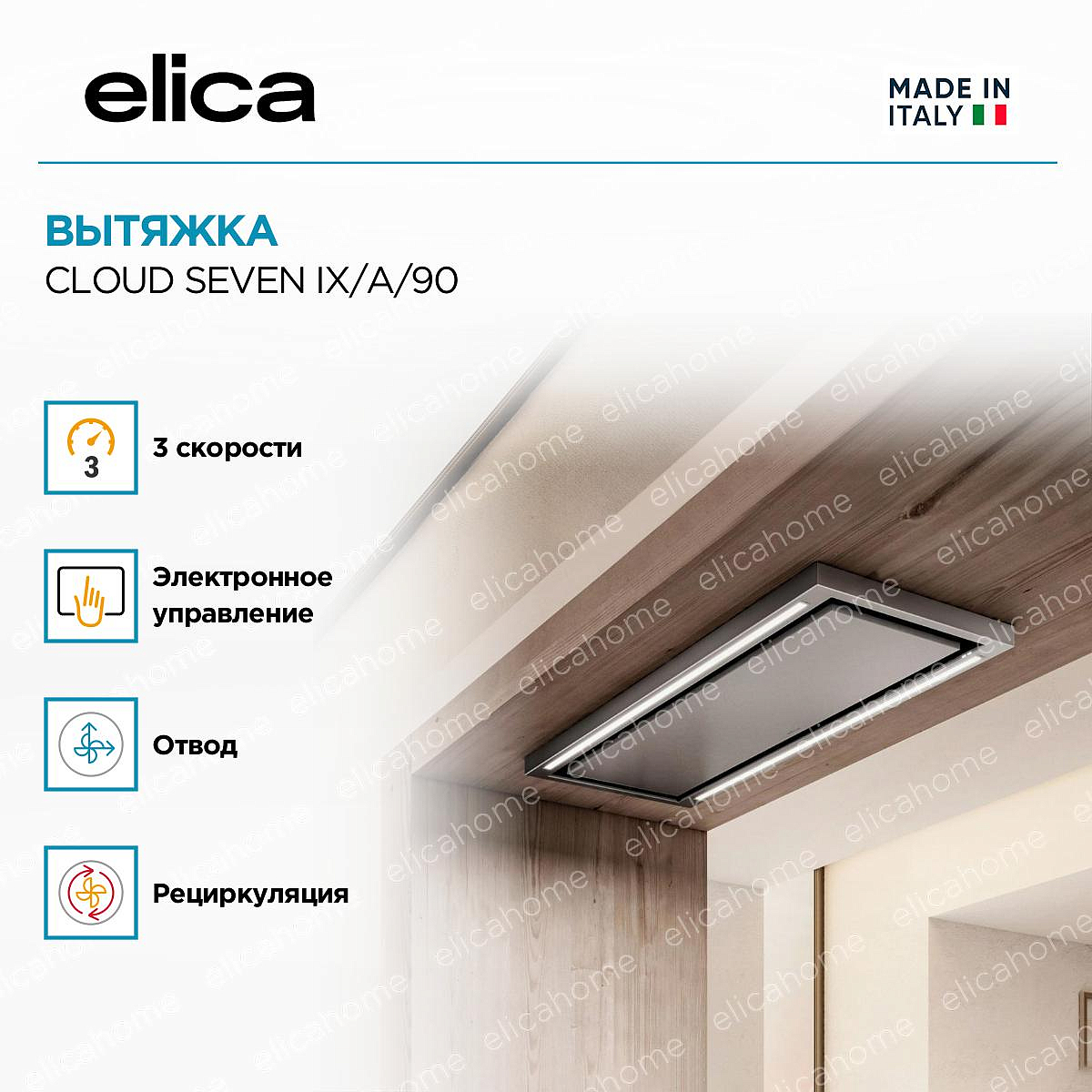 Устройство крепится к потолку. Существует два типа вытяжек Elica, крепящихся к потолку: островные (с дымоходом) и подвесные (без дымохода).