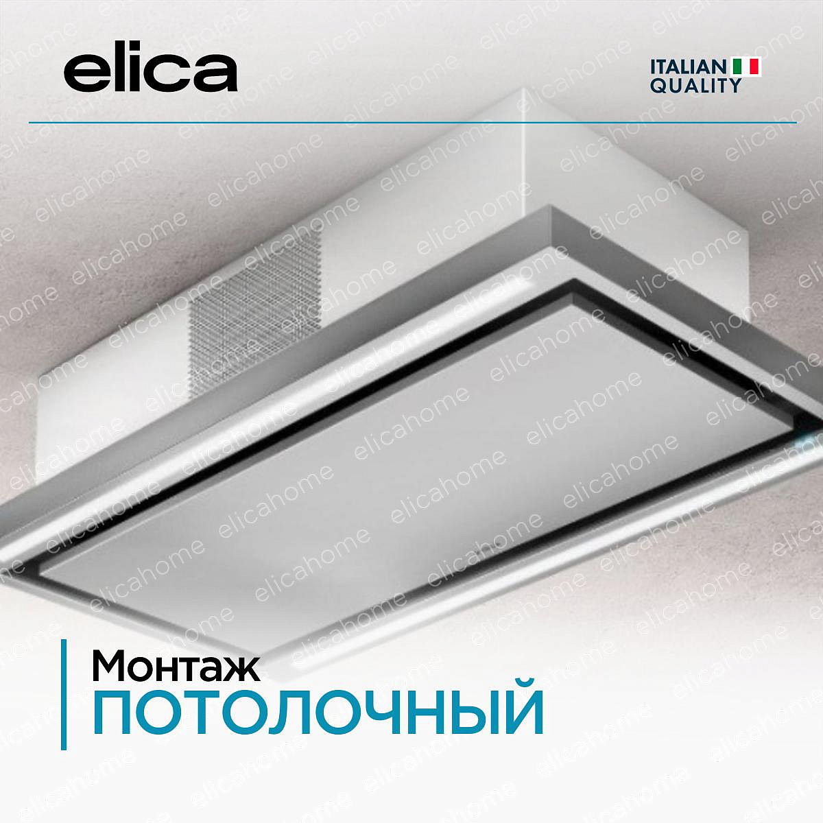Устройство крепится к потолку. Существует два типа вытяжек Elica, крепящихся к потолку: островные (с дымоходом) и подвесные (без дымохода).