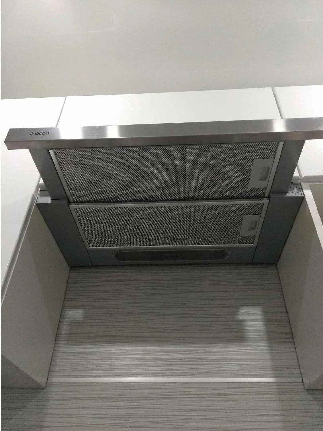 Устройства, которые встраиваются в шкаф или в столешницу. При этом двигатель и все функционирующие элементы, как правило, скрыты. На поверхности остаются лишь декоративные фасады, козырьки и панели управления.