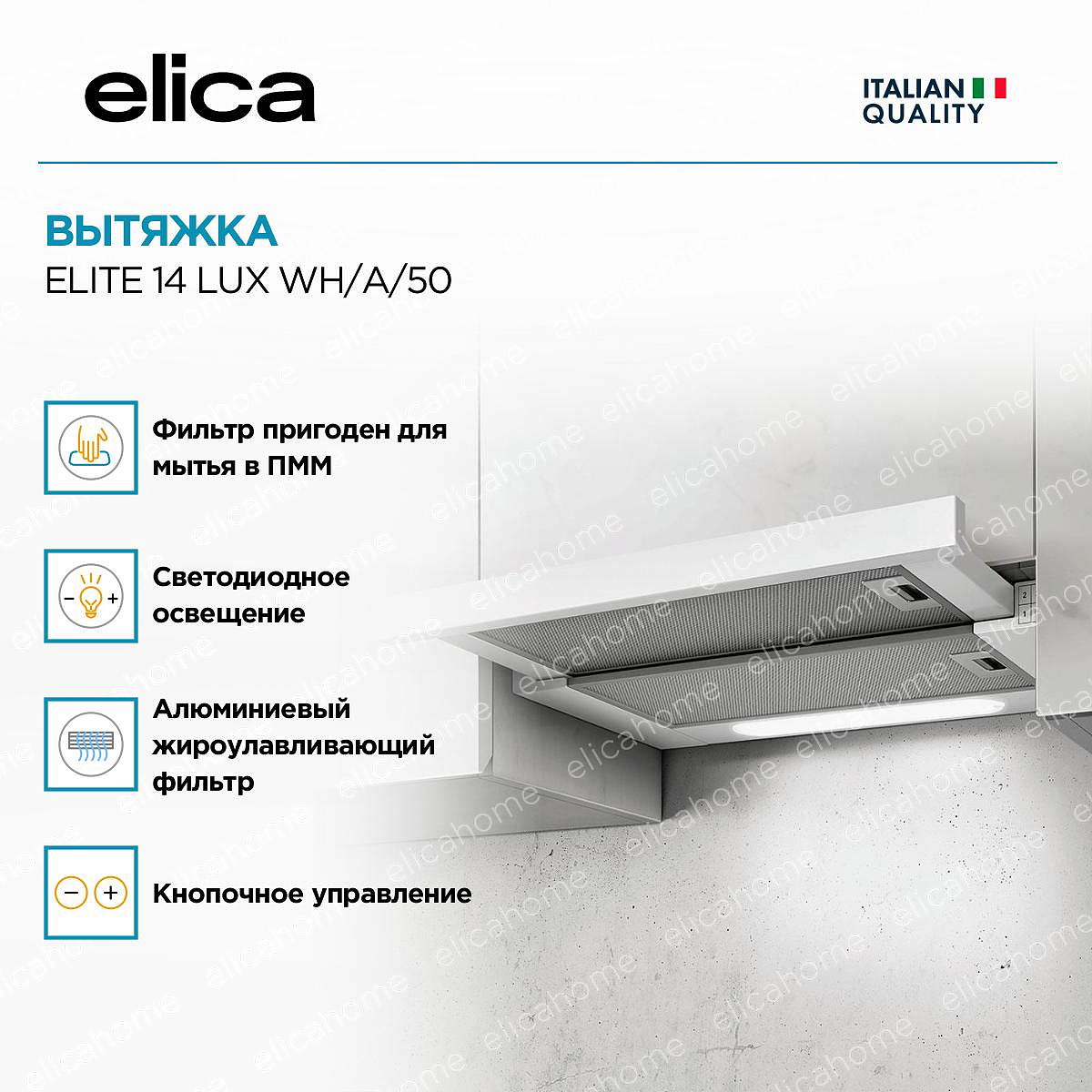 Дизайн. Встраиваемая в подвесной шкаф вытяжка ELICA ELITE 14 LUX WH/A/50 имеет уменьшенную ширину 50 см. Модель выполнена в цветах «нержавеющая сталь» и белый, поэтому может быть интегрирована в любой современный кухонный интерьер.