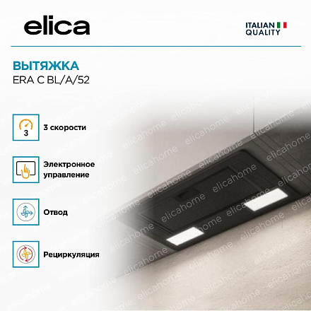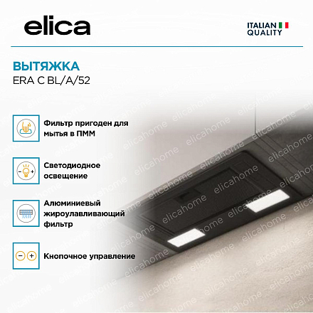 Вытяжка Elica ERA C BL/A/52 сочетает в себе стильный дизайн и передовые технологии. Она будет идеальным выбором для тех, кто ценит комфорт и эстетику в доме. Одна из особенностей дизайна — черный цвет рабочей поверхности. Прибор выглядит элегантно и стильно. Металлический корпус прочный и надежный. Он полностью убирается в подвесной шкаф. Ухаживать за изделием просто. Достаточно периодически протирать его мягкой салфеткой. Устройство хорошо сочетается со всеми видами кухонных гарнитуров. Модель оснащена электронным управлением. Вы с легкостью настроите нужный режим и скорость.