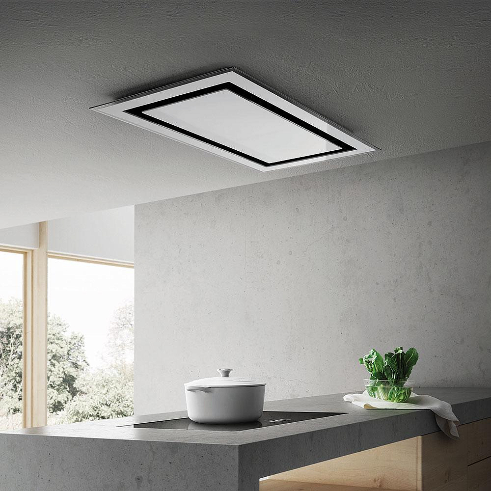 Устройство крепится к потолку. Существует два типа вытяжек Elica, крепящихся к потолку: островные (с дымоходом) и подвесные (без дымохода).