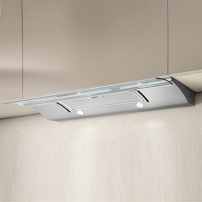 Дизайн. Встраиваемая в подвесной шкаф вытяжка ELICA GLIDE IX/A/90 имеет увеличенную ширину 90 см. Дизайн дополняется выдвижным козырьком из прозрачного стекла, за которым расположен эффективный жироулавливающий фильтр из нержавеющей стали. Две яркие галогенные лампы общей мощностью 40 Вт станут полноценным источником освещения варочной зоны.