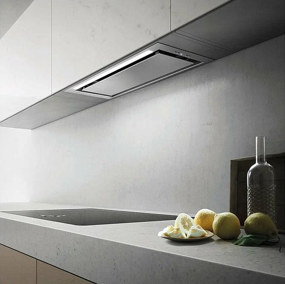 Устройства, которые встраиваются в шкаф или в столешницу. При этом двигатель и все функционирующие элементы, как правило, скрыты. На поверхности остаются лишь декоративные фасады, козырьки и панели управления.
