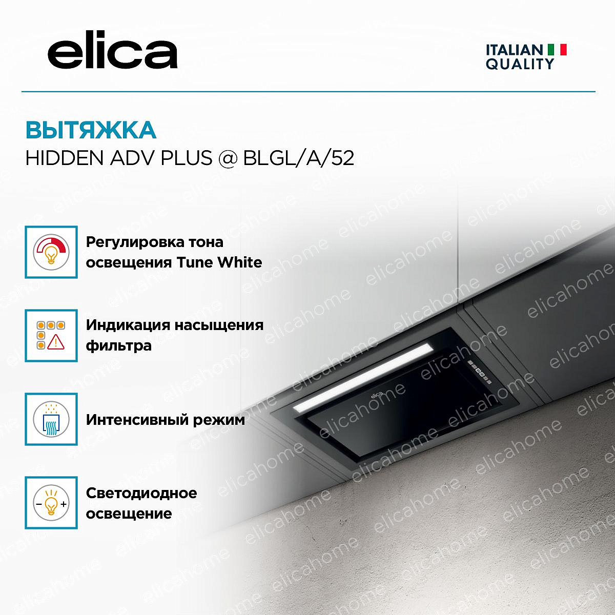 Уникальная система светодиодной подсветки, которая позволяет регулировать ее интенсивность в зависимости от необходимости увеличивая или убавляя яркость. Кроме того, можно задать даже оттенок света, сделав его более теплым ли холодном в зависимости от ваших предпочтений. Настройки можно задавать также в приложении ElicaConnect при помощи мобильного устройства.