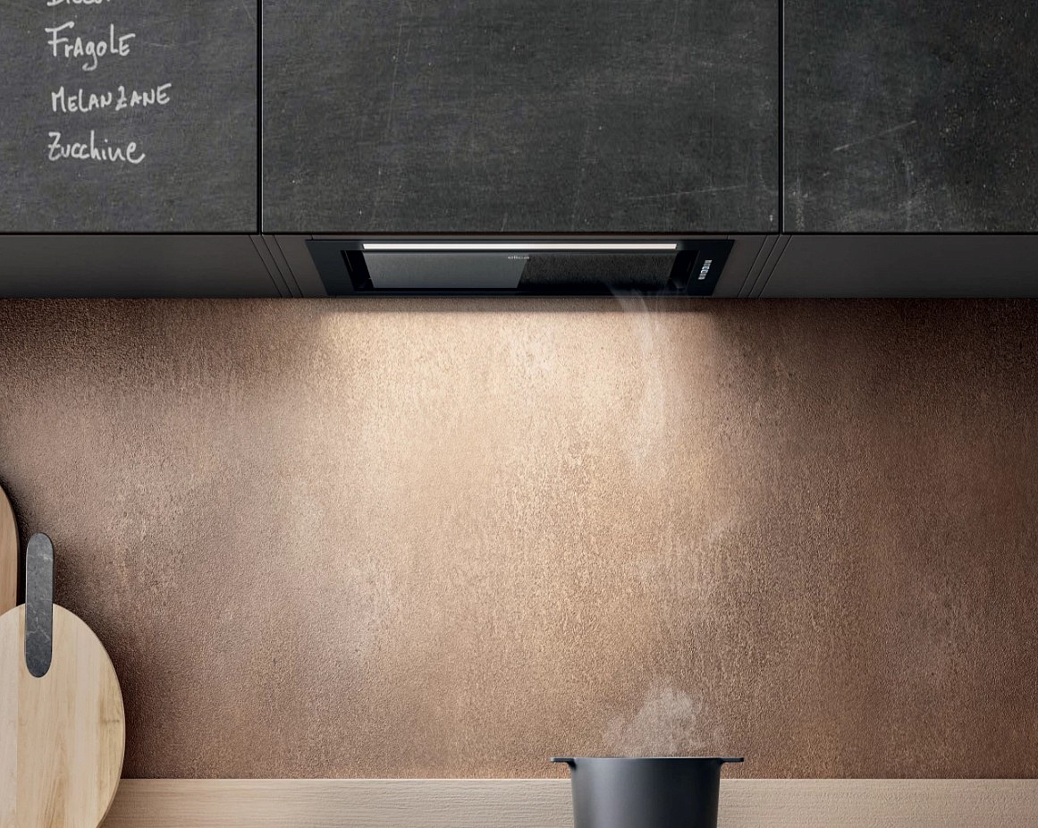 Устройства, которые встраиваются в шкаф или в столешницу. При этом двигатель и все функционирующие элементы, как правило, скрыты. На поверхности остаются лишь декоративные фасады, козырьки и панели управления.