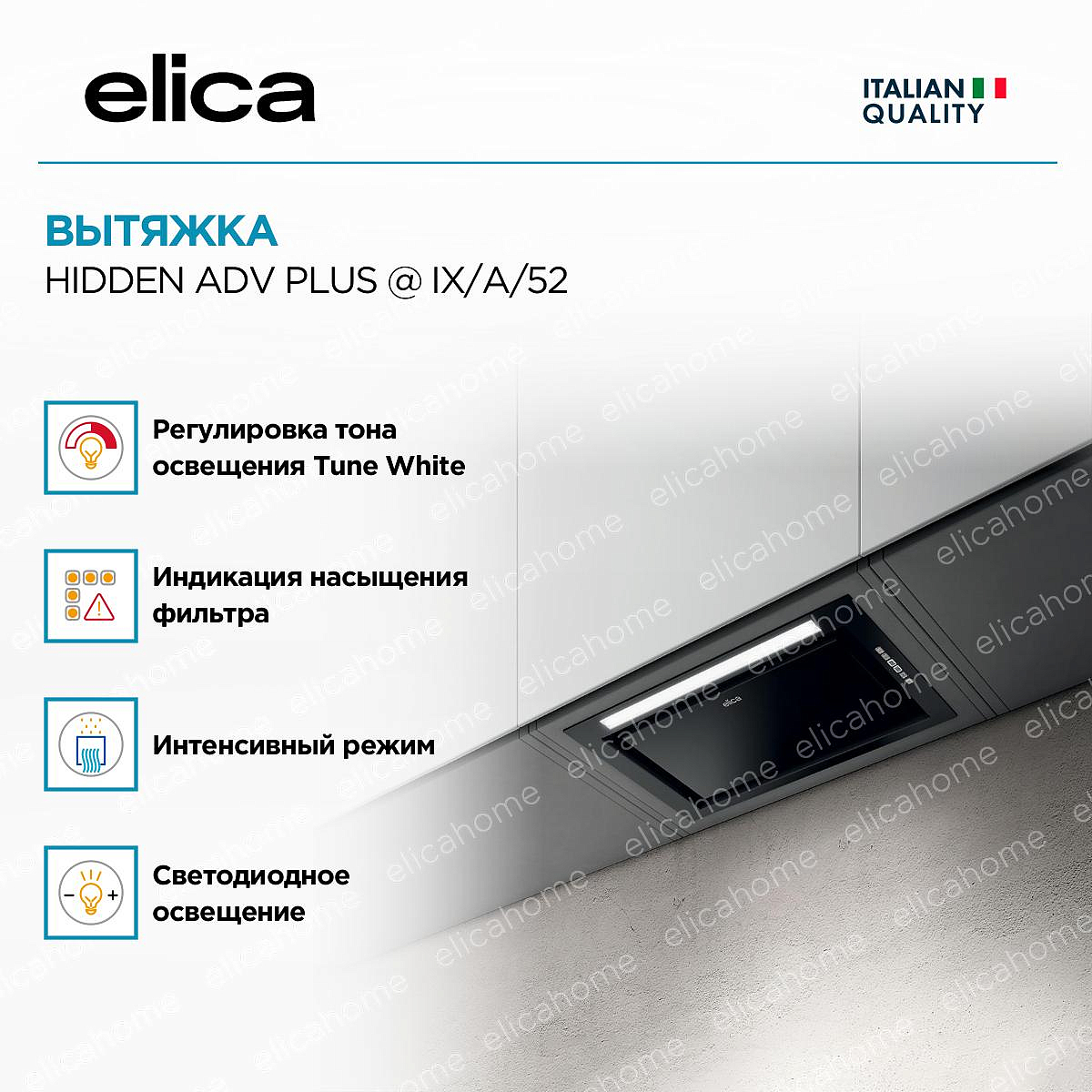Уникальная система светодиодной подсветки, которая позволяет регулировать ее интенсивность в зависимости от необходимости увеличивая или убавляя яркость. Кроме того, можно задать даже оттенок света, сделав его более теплым ли холодном в зависимости от ваших предпочтений. Настройки можно задавать также в приложении ElicaConnect при помощи мобильного устройства.