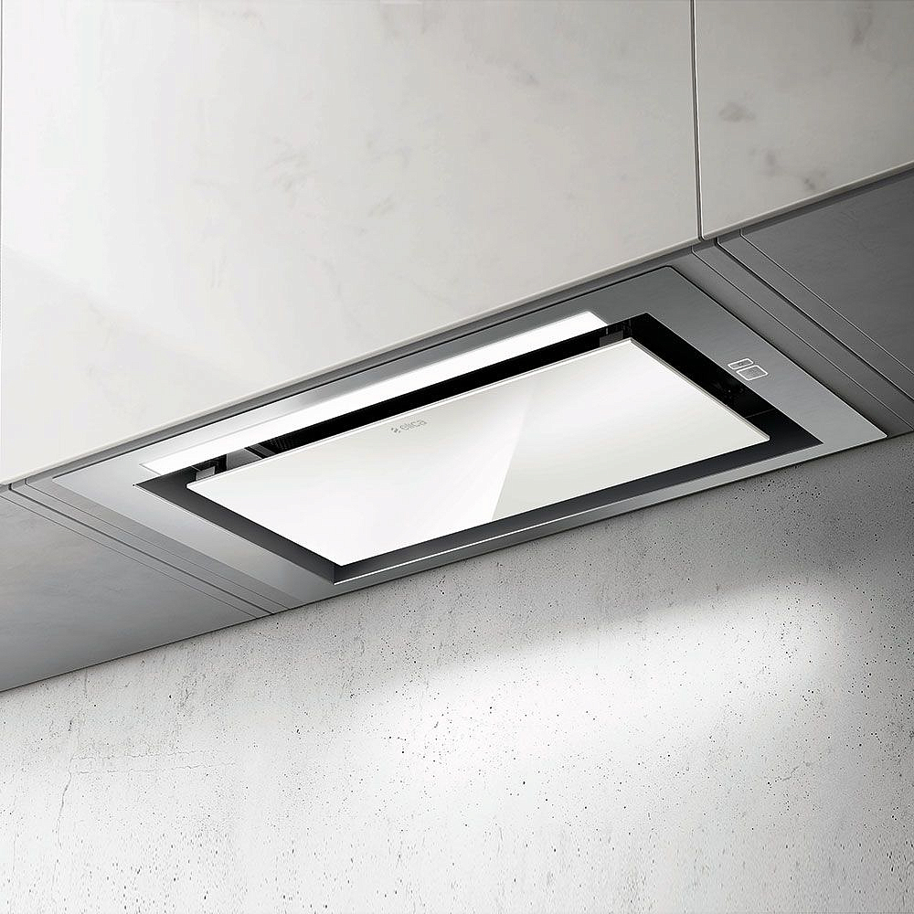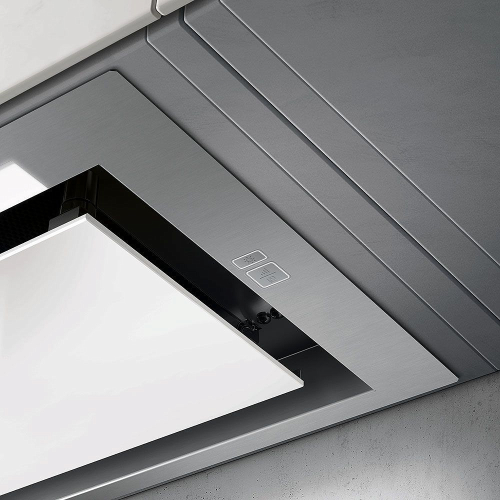 Дизайн. Встраиваемая в подвесной шкаф вытяжка HIDDEN HT IXGL/A/90 выполнена в цвете «нержавеющая сталь» с отделкой из белого стекла. Прямоугольная форма прибора проста и элегантна. Яркая подсветка STRIP LED подчеркивает простой геометрический дизайн и улучшает обзор над варочной поверхностью.