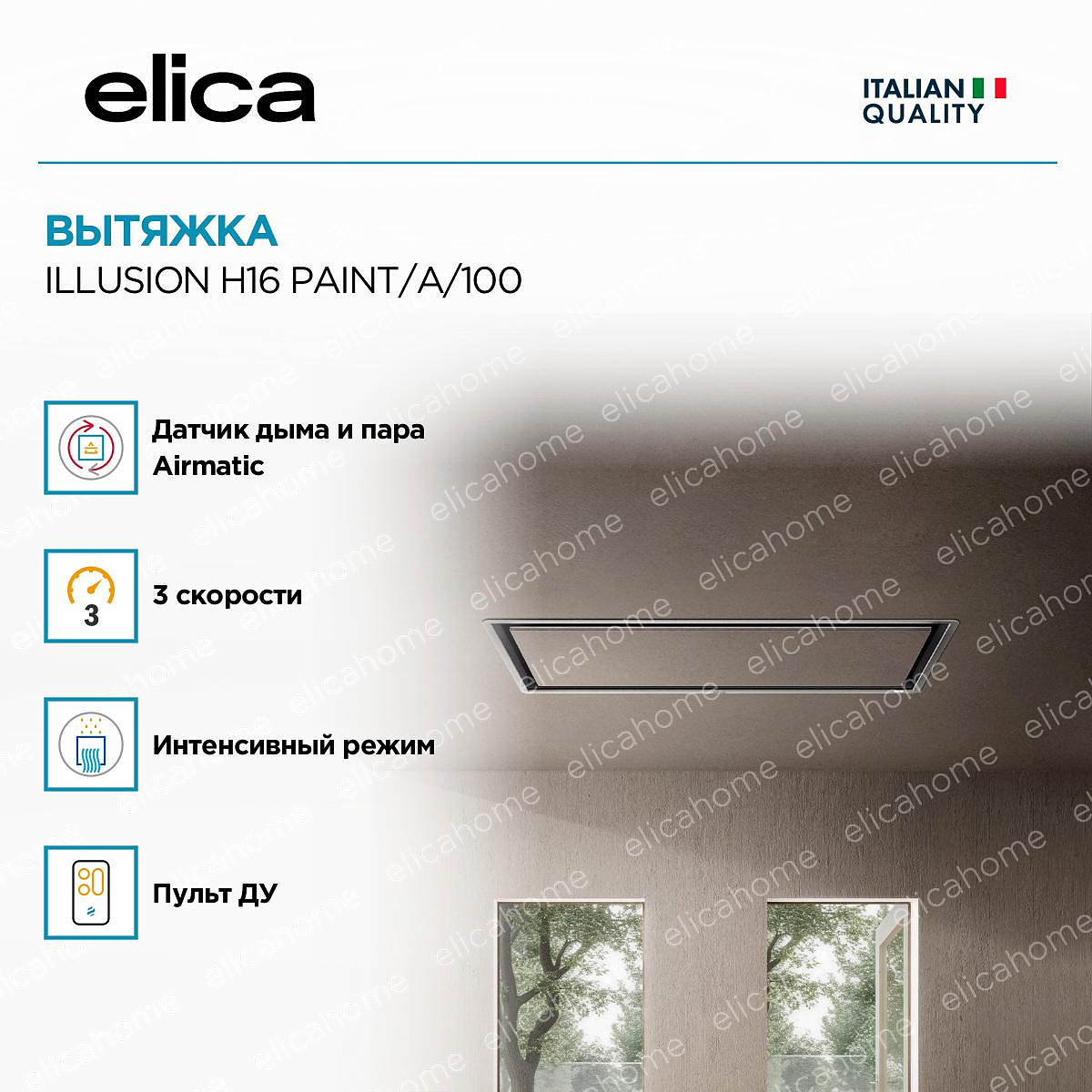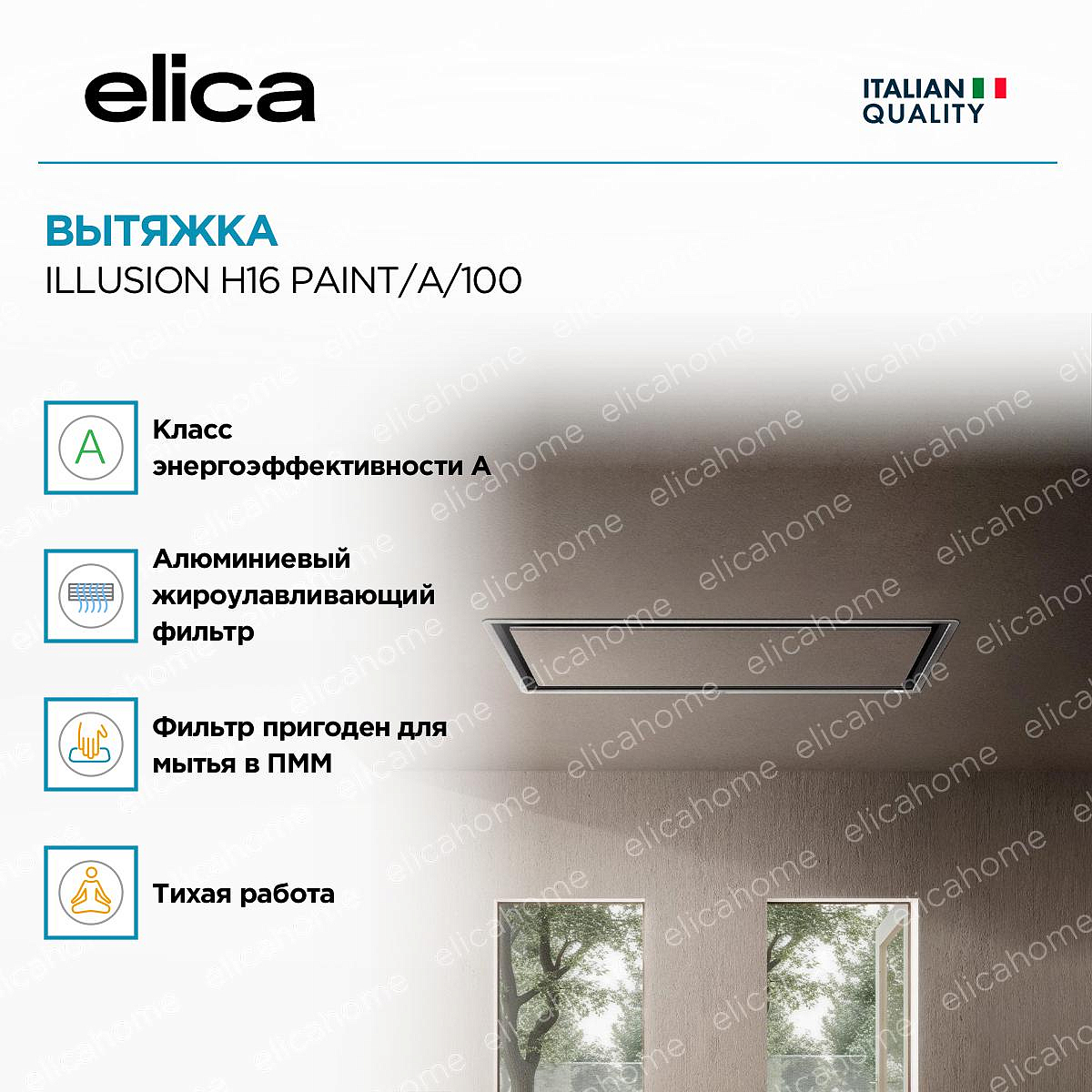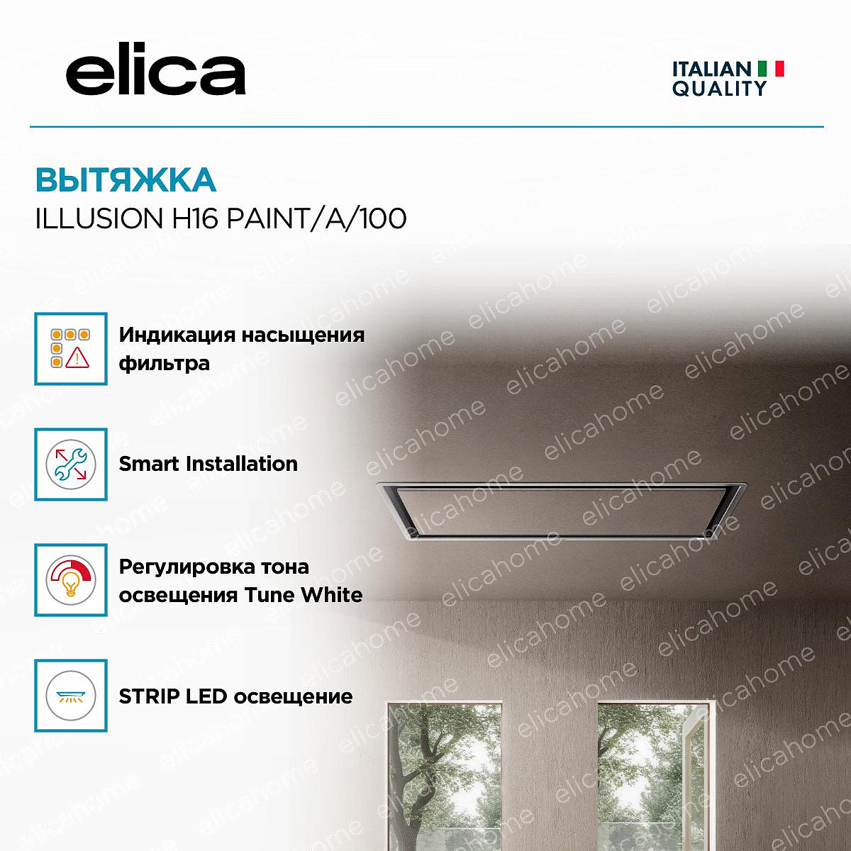 Уникальная система светодиодной подсветки, которая позволяет регулировать ее интенсивность в зависимости от необходимости увеличивая или убавляя яркость. Кроме того, можно задать даже оттенок света, сделав его более теплым ли холодном в зависимости от ваших предпочтений. Настройки можно задавать также в приложении ElicaConnect при помощи мобильного устройства.