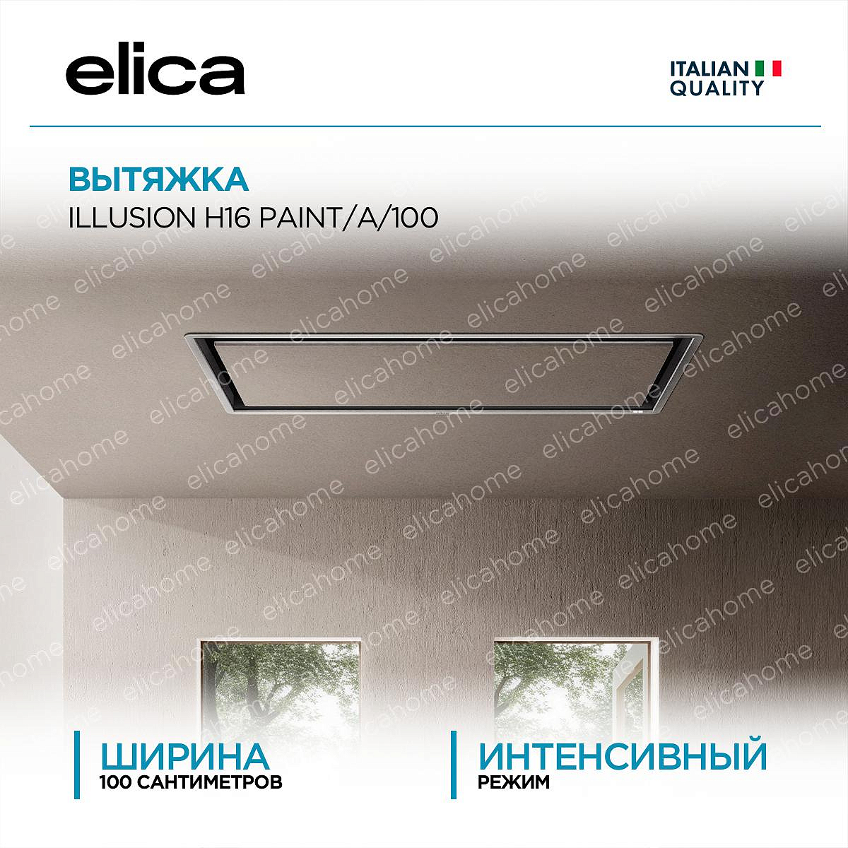 Дизайн: Встраиваемая в потолок вытяжка ELICA ILLUSION H16 PAINT/A/100 с рамкой из нержавеющей стали. Ширина устройство составляет 100 см, что гарантирует широкую зону обхвата рабочей части. Фасад можно преобразить по дизайну клиента.
