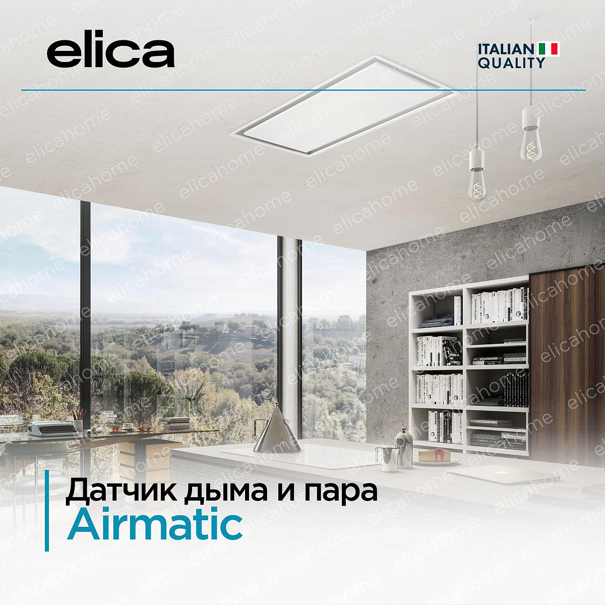 Устройство крепится к потолку. Существует два типа вытяжек Elica, крепящихся к потолку: островные (с дымоходом) и подвесные (без дымохода).