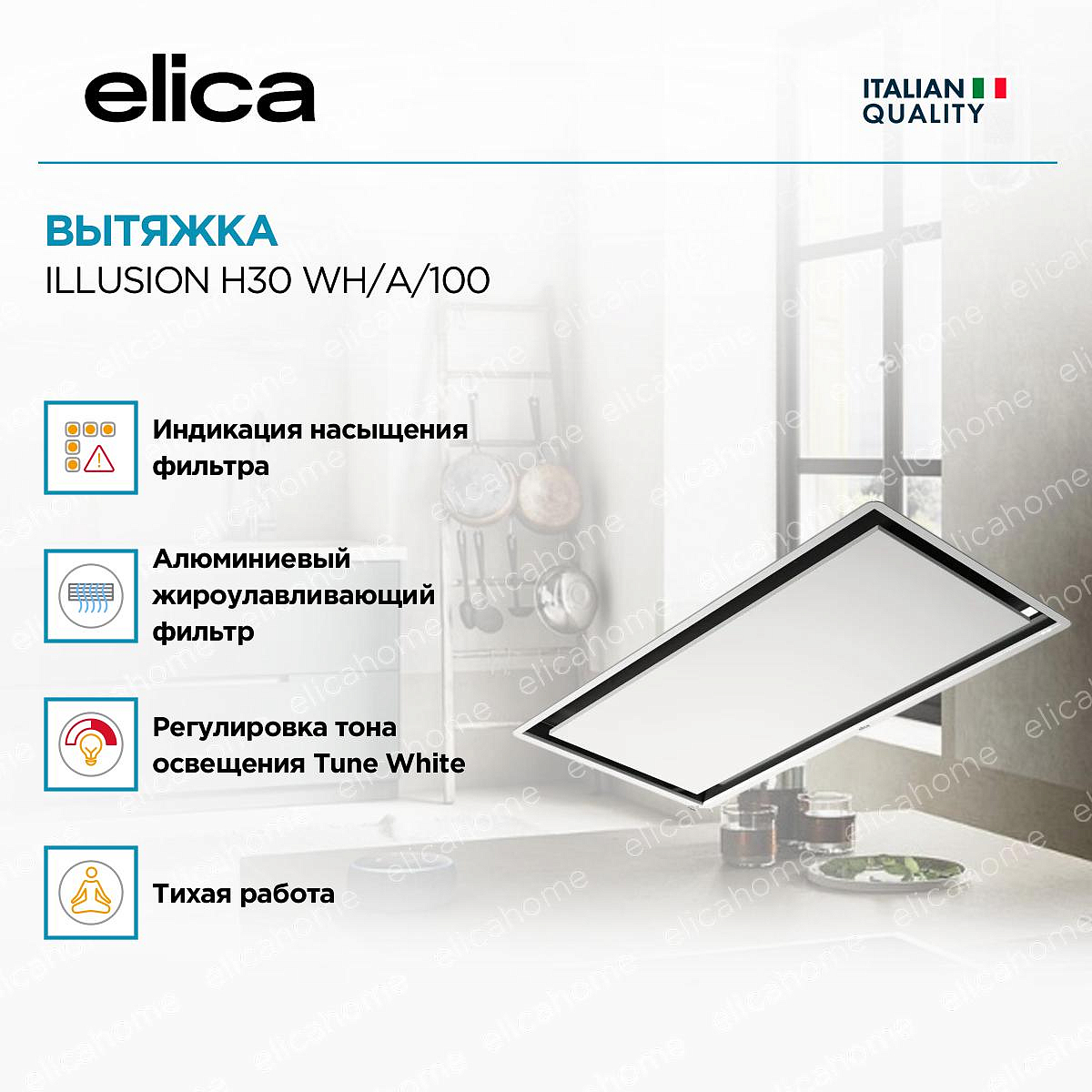 Уникальная система светодиодной подсветки, которая позволяет регулировать ее интенсивность в зависимости от необходимости увеличивая или убавляя яркость. Кроме того, можно задать даже оттенок света, сделав его более теплым ли холодном в зависимости от ваших предпочтений. Настройки можно задавать также в приложении ElicaConnect при помощи мобильного устройства.