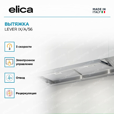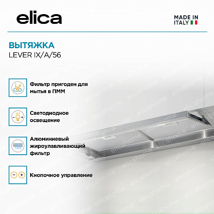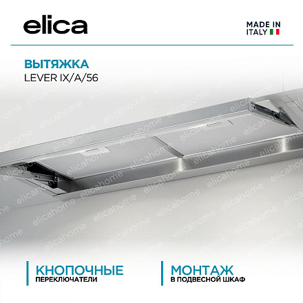 Вытяжка Elica LEVER IX/A/56 имеет видимую часть в цвете «Нержавеющая сталь». За счет того, что модель встраивается в шкаф, вам будут видны только панель управления, освещение и фильтр. Современный и универсальный дизайн подойдет к любой кухне и дополнит ее интерьер.