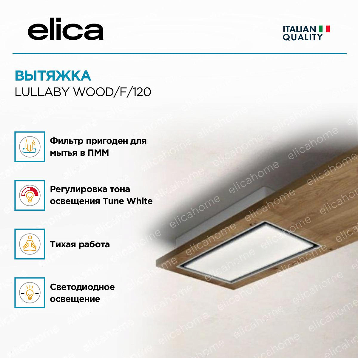 Уникальная система светодиодной подсветки, которая позволяет регулировать ее интенсивность в зависимости от необходимости увеличивая или убавляя яркость. Кроме того, можно задать даже оттенок света, сделав его более теплым ли холодном в зависимости от ваших предпочтений. Настройки можно задавать также в приложении ElicaConnect при помощи мобильного устройства.